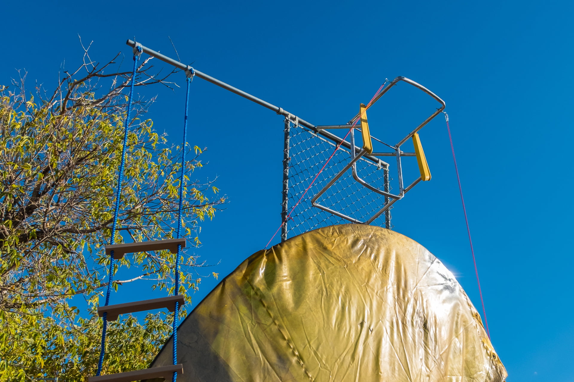 welding screen, chain link fencing, aluminum folding chair, rain barrel, tarp, plastic, steel, rope, wood